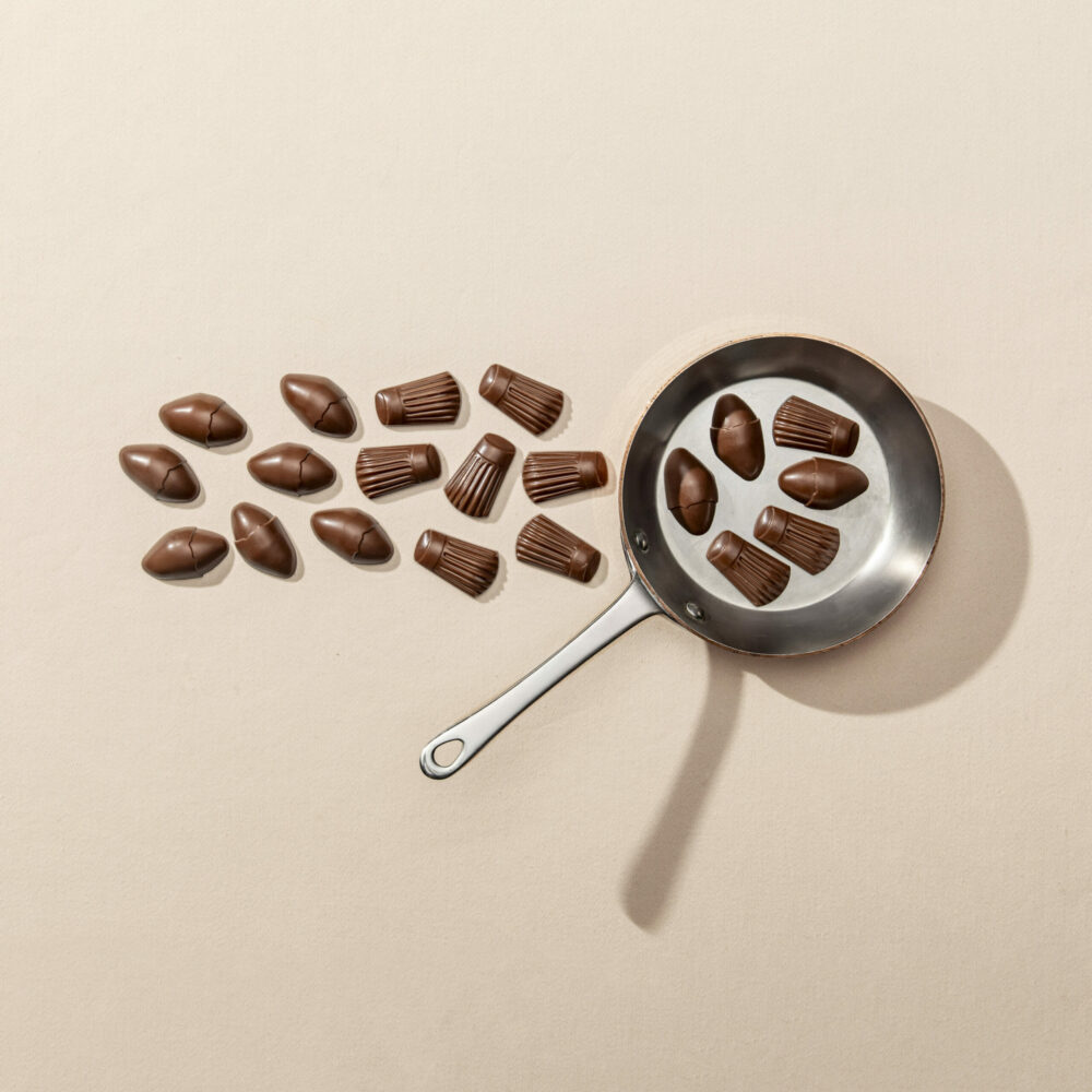 L’œuf dans la coque : Praliné sablé breton, Chocolat au lait Bitter lactée 39%.